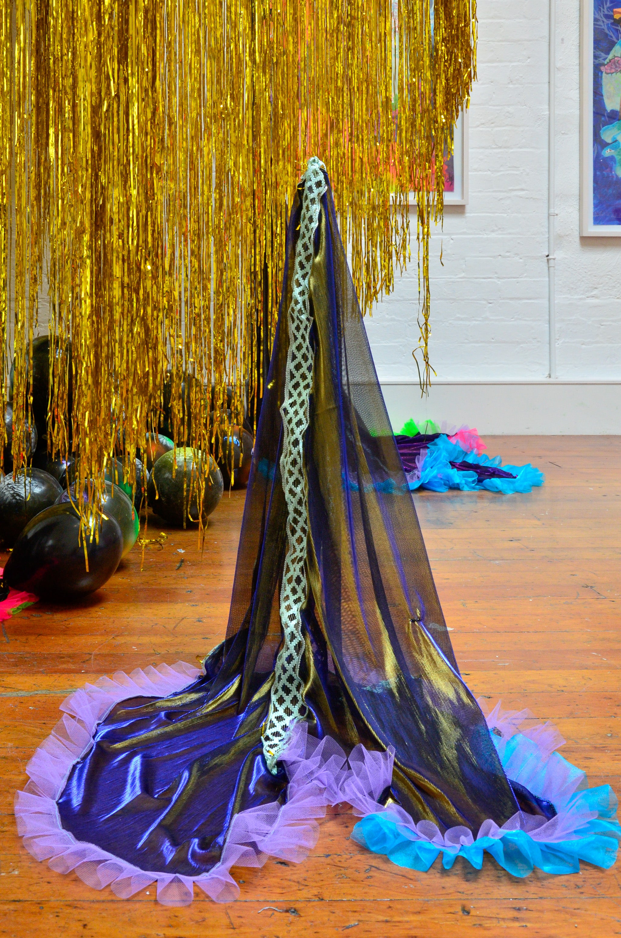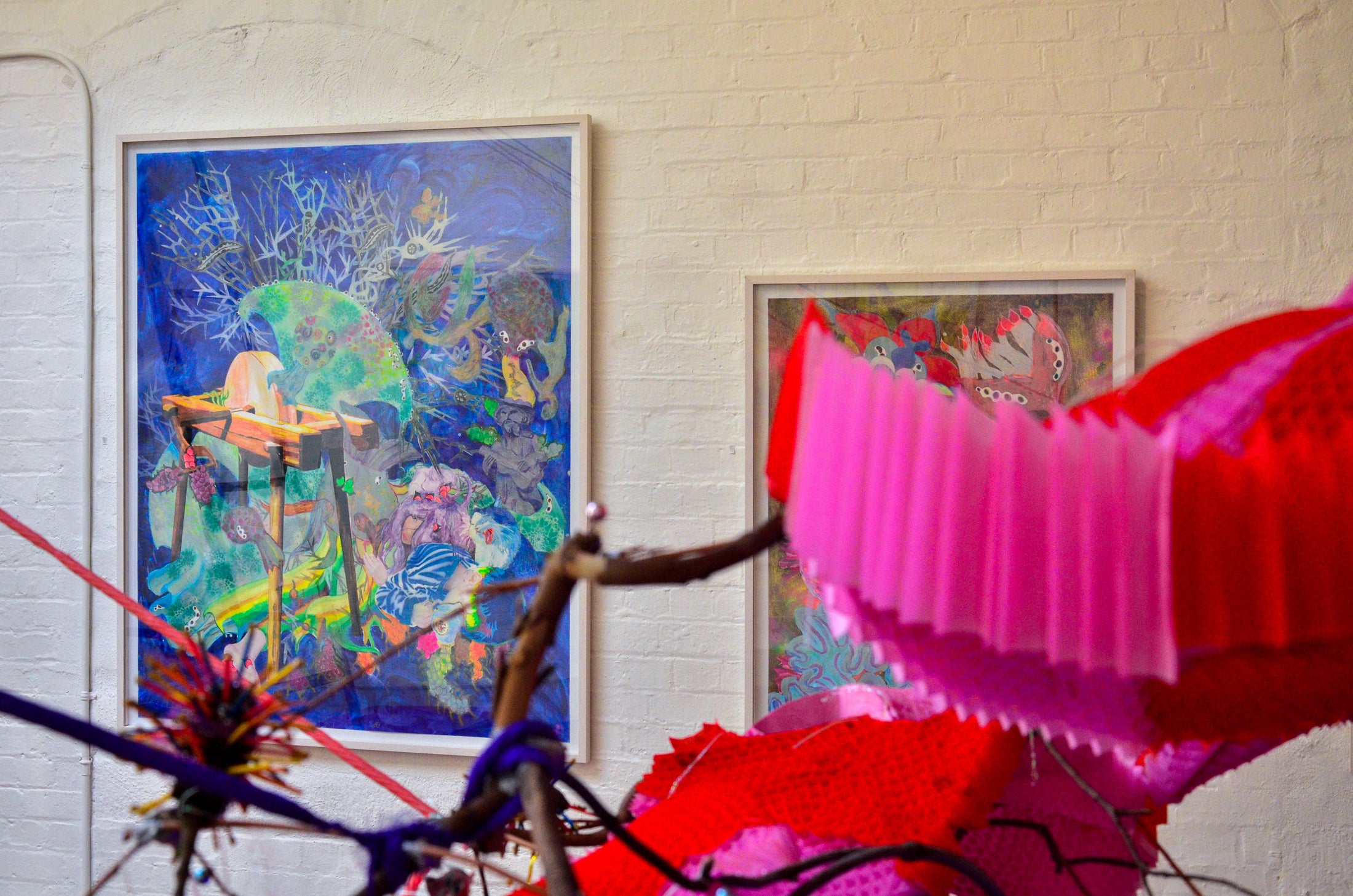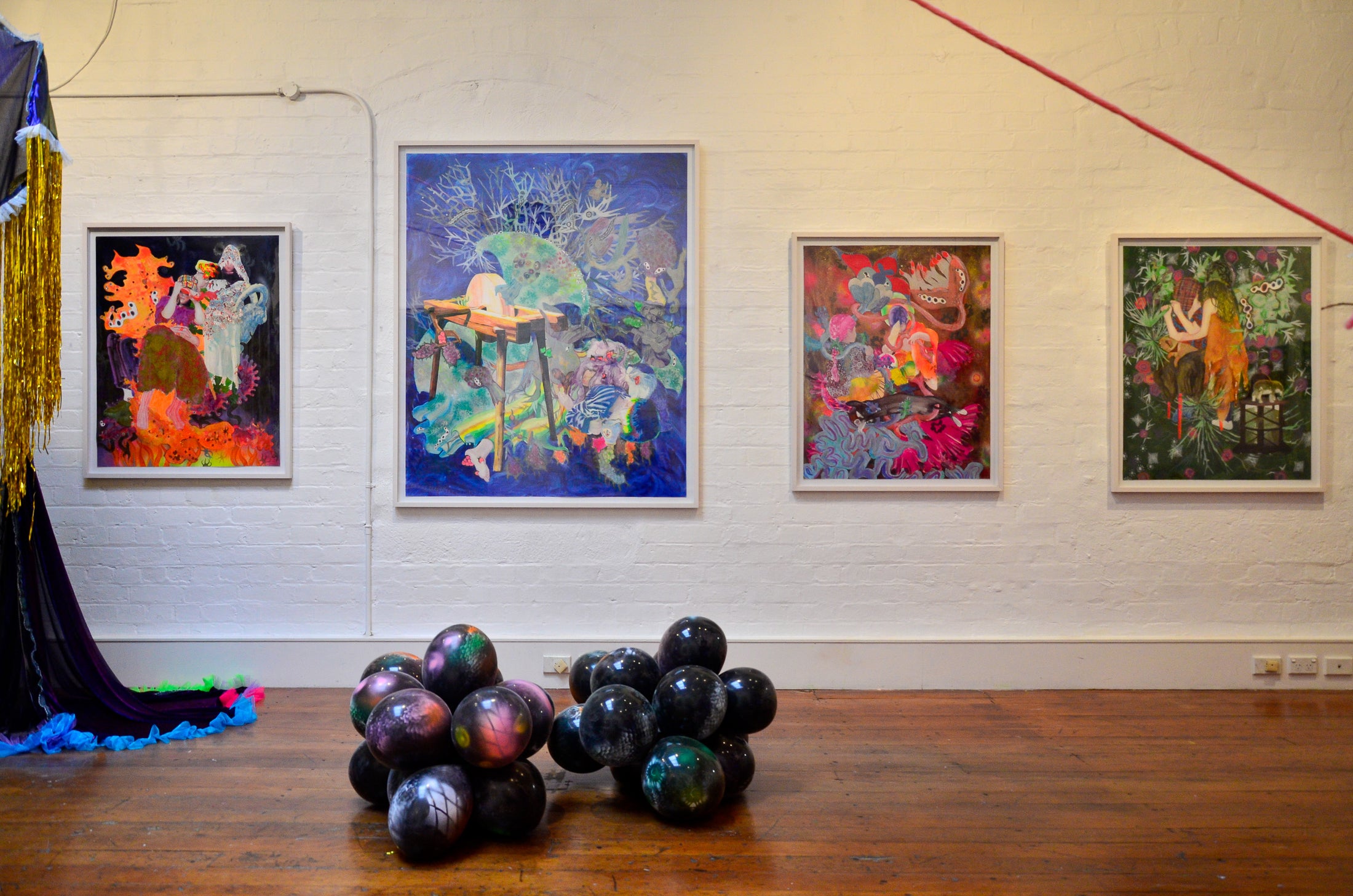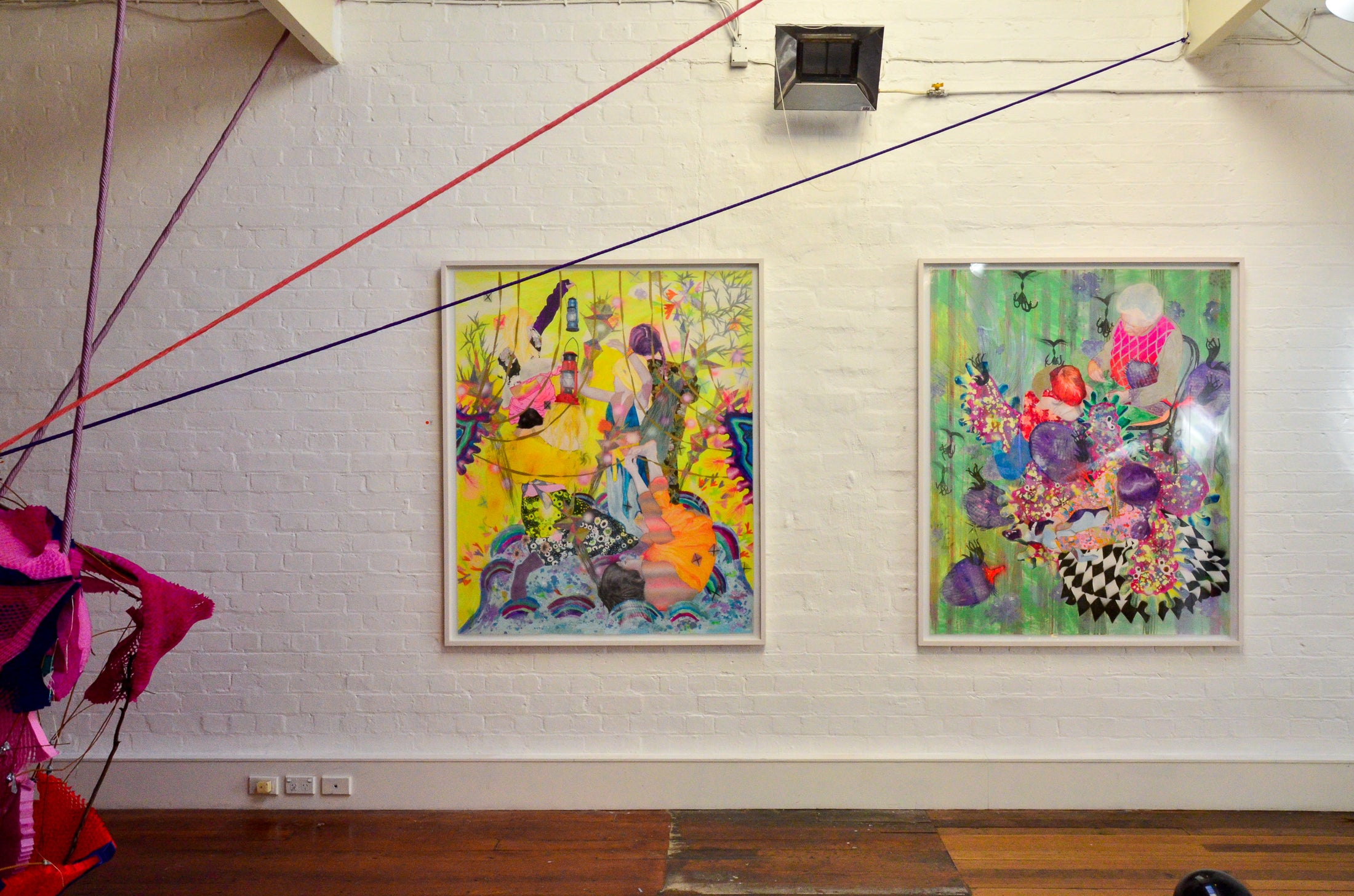 Their current collaborations consist of both exquisite illustration works, in which they make use of their paintings and "left overs" of performances, like costumes and fabric sculptures. Both are displayed together to create an environment that is at the same time powerfully dominated by illustration and theatrical presence.They work backwards, painting in layers on the reverse of acrylic glass, using different materials, such as enamel, oil colour, watercolour, crayon, glitter and spray.