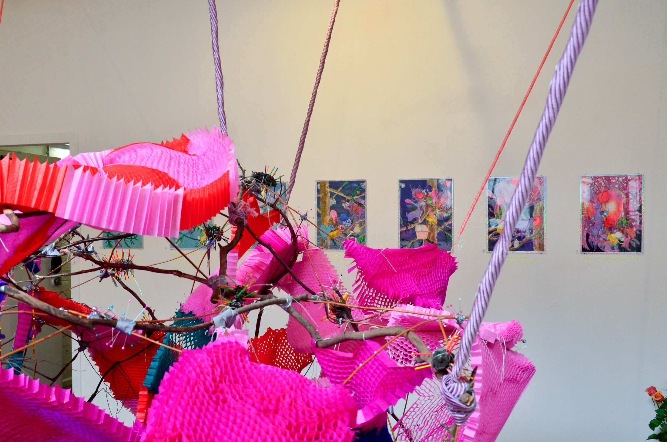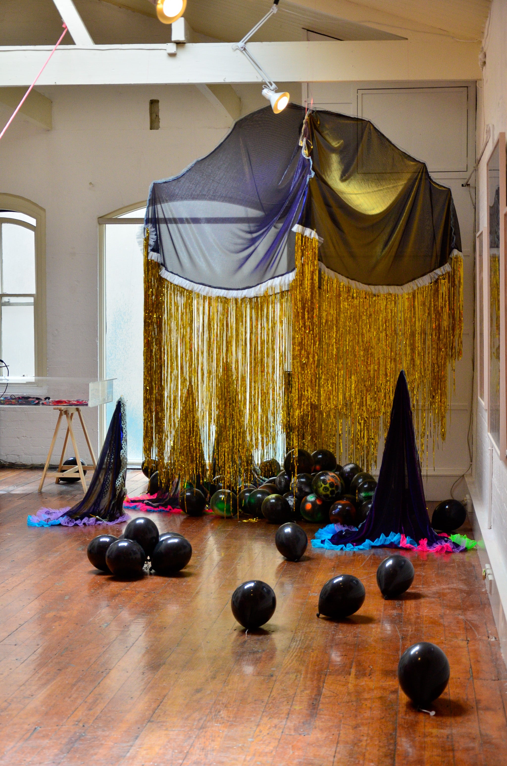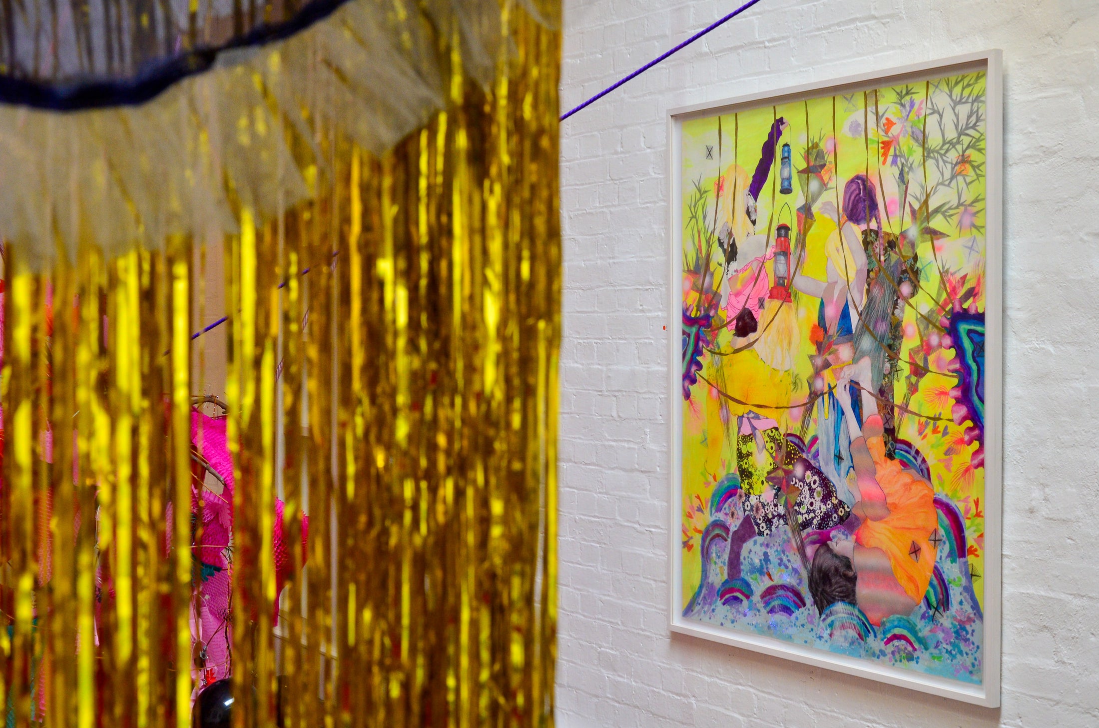 Their current collaborations consist of both exquisite illustration works, in which they make use of their paintings and "left overs" of performances, like costumes and fabric sculptures. Both are displayed together to create an environment that is at the same time powerfully dominated by illustration and theatrical presence.They work backwards, painting in layers on the reverse of acrylic glass, using different materials, such as enamel, oil colour, watercolour, crayon, glitter and spray.