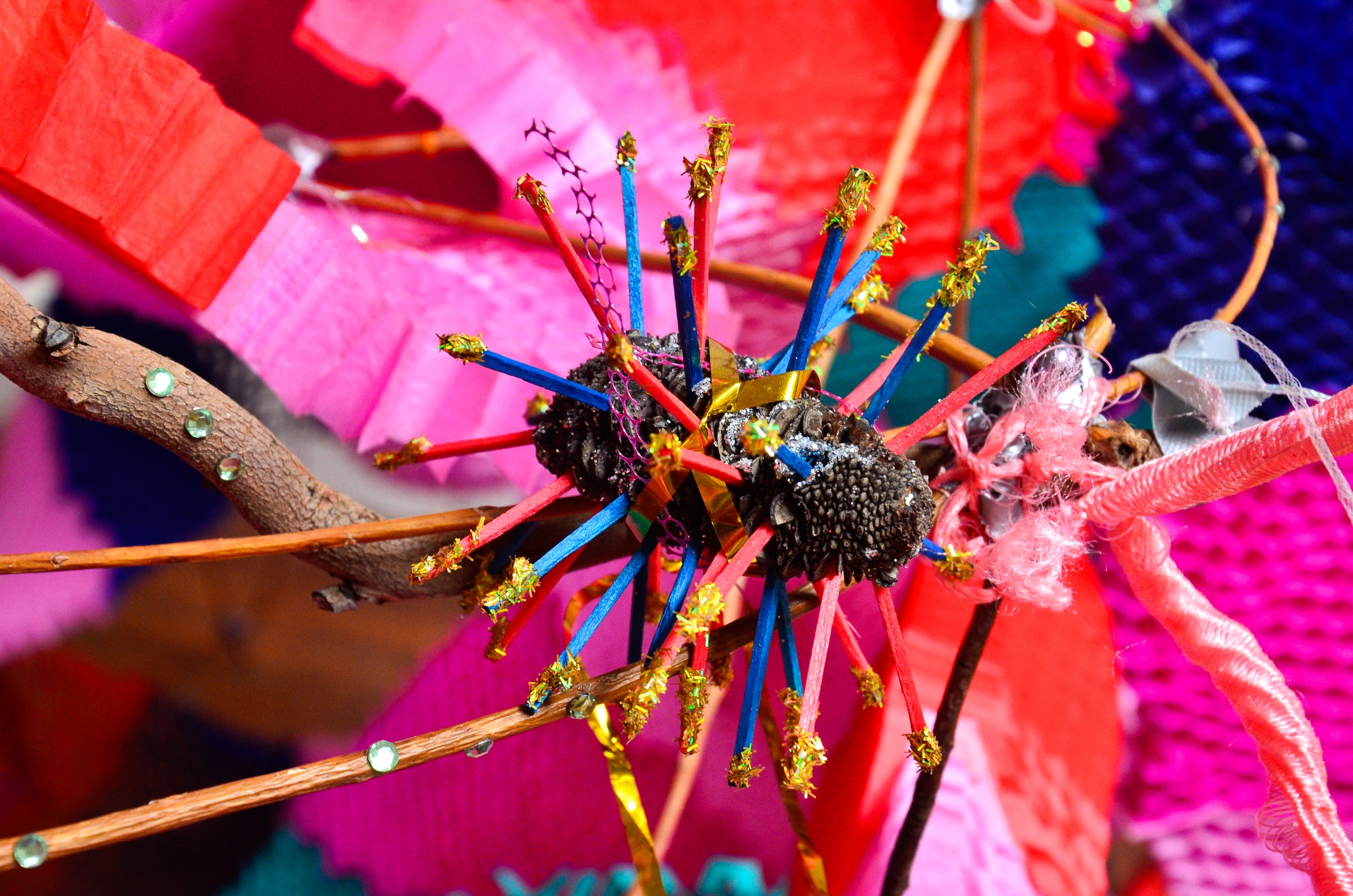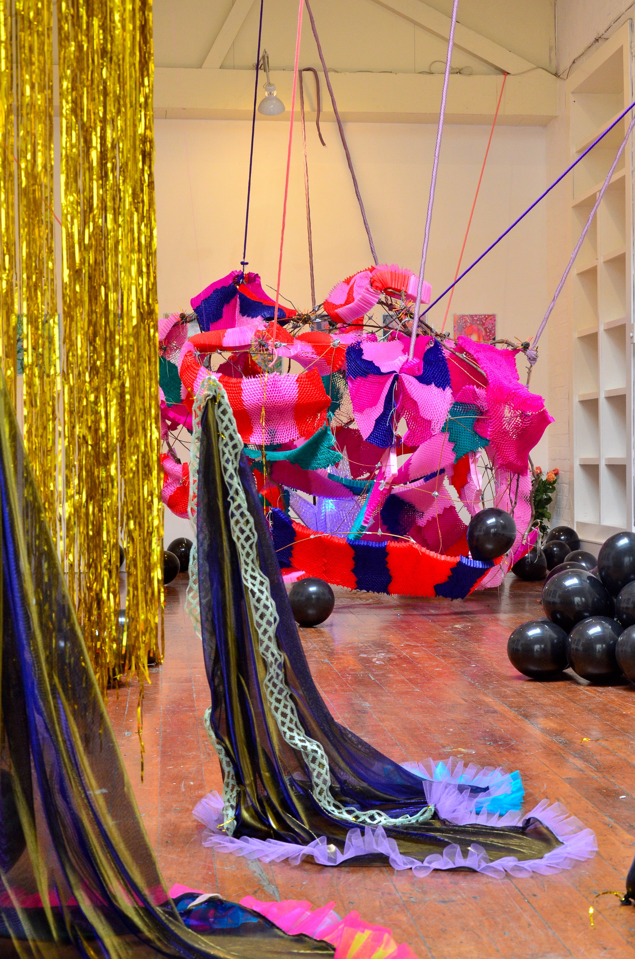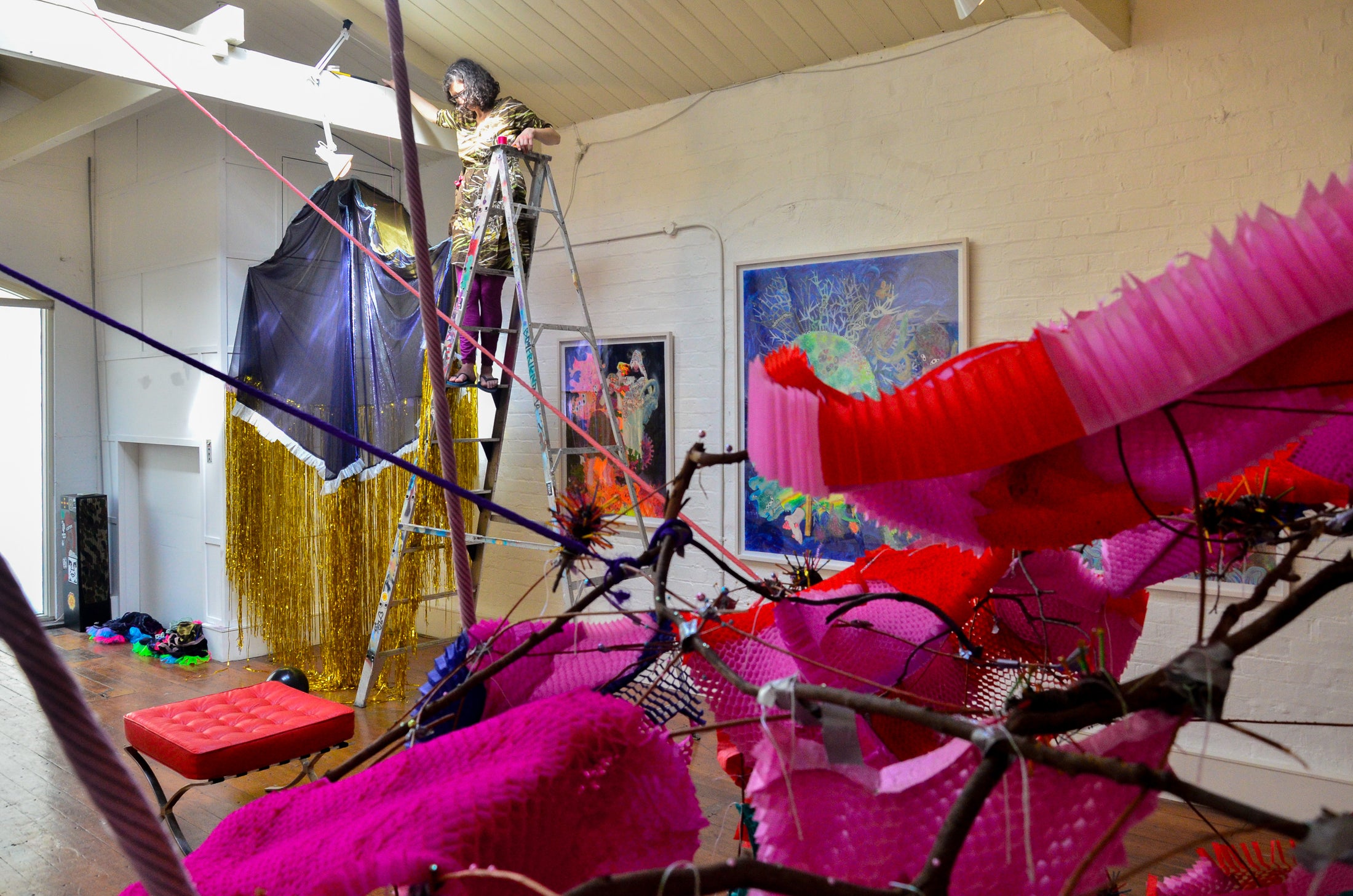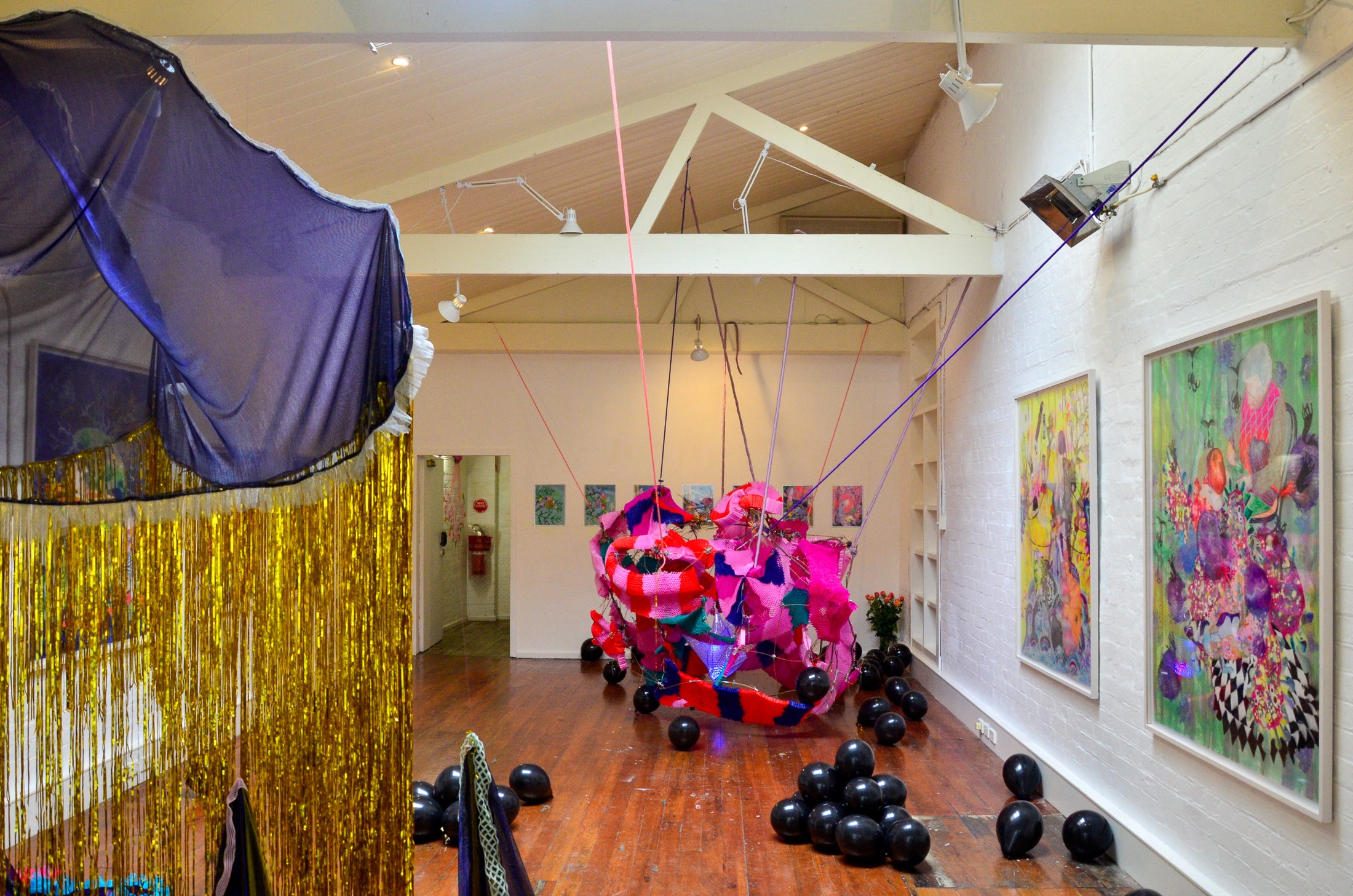 Their current collaborations consist of both exquisite illustration works, in which they make use of their paintings and "left overs" of performances, like costumes and fabric sculptures. Both are displayed together to create an environment that is at the same time powerfully dominated by illustration and theatrical presence.They work backwards, painting in layers on the reverse of acrylic glass, using different materials, such as enamel, oil colour, watercolour, crayon, glitter and spray.