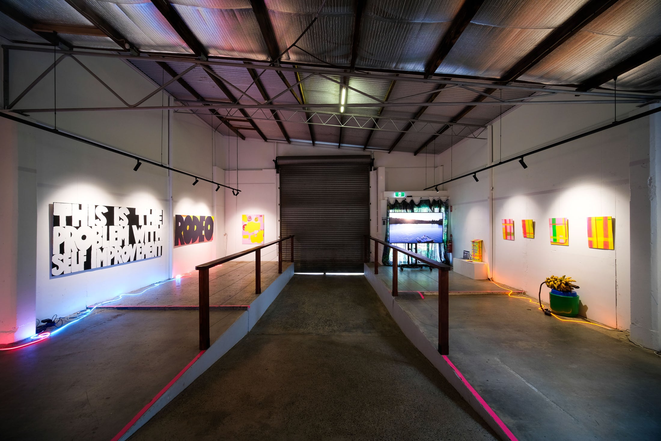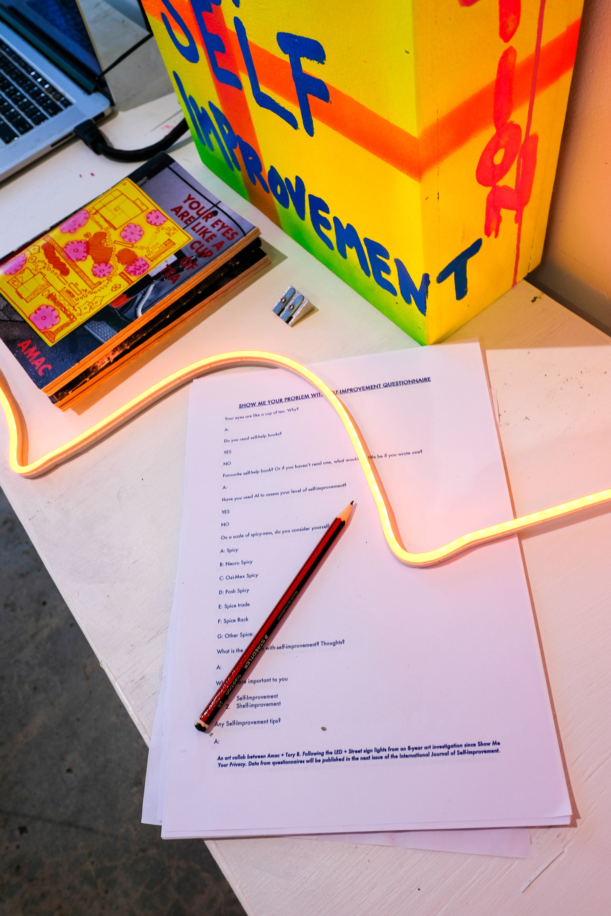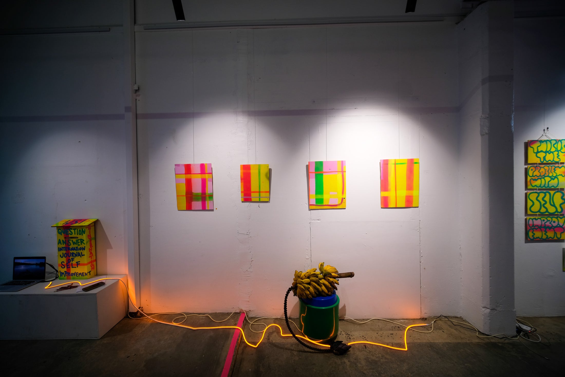 Operating at the intersection of art and cultural archaeology, I started with the question of self-improvement. I followed the LED lights from there, experimenting with new paintings, colour combos, text, tea, and speed reading 50 of the world's best self-help books.