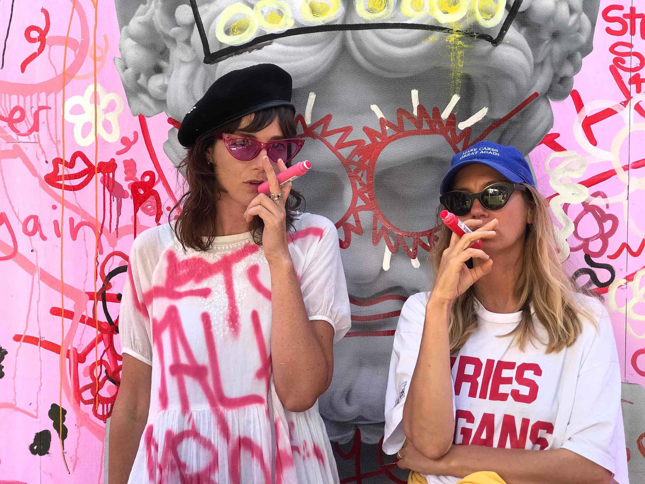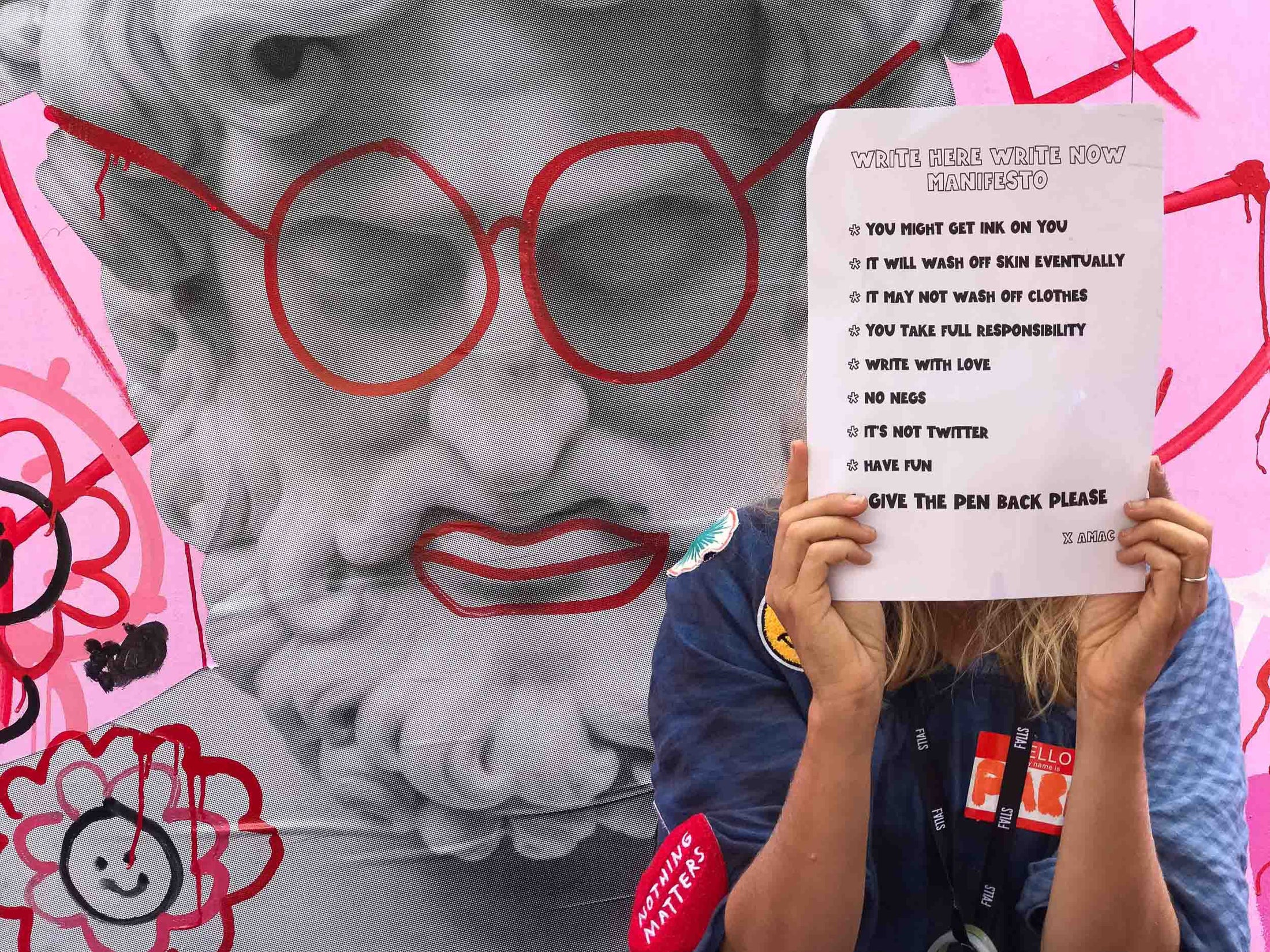 Guests checked in at the pen bureau to receive ink mops and the Write Here Write Now Manifesto, an ethos for positive participation. Artists Tory Bauer and Mylee Grace wrote text on the wall and staffed the pen bureau, demonstrating the usage of ink mops.