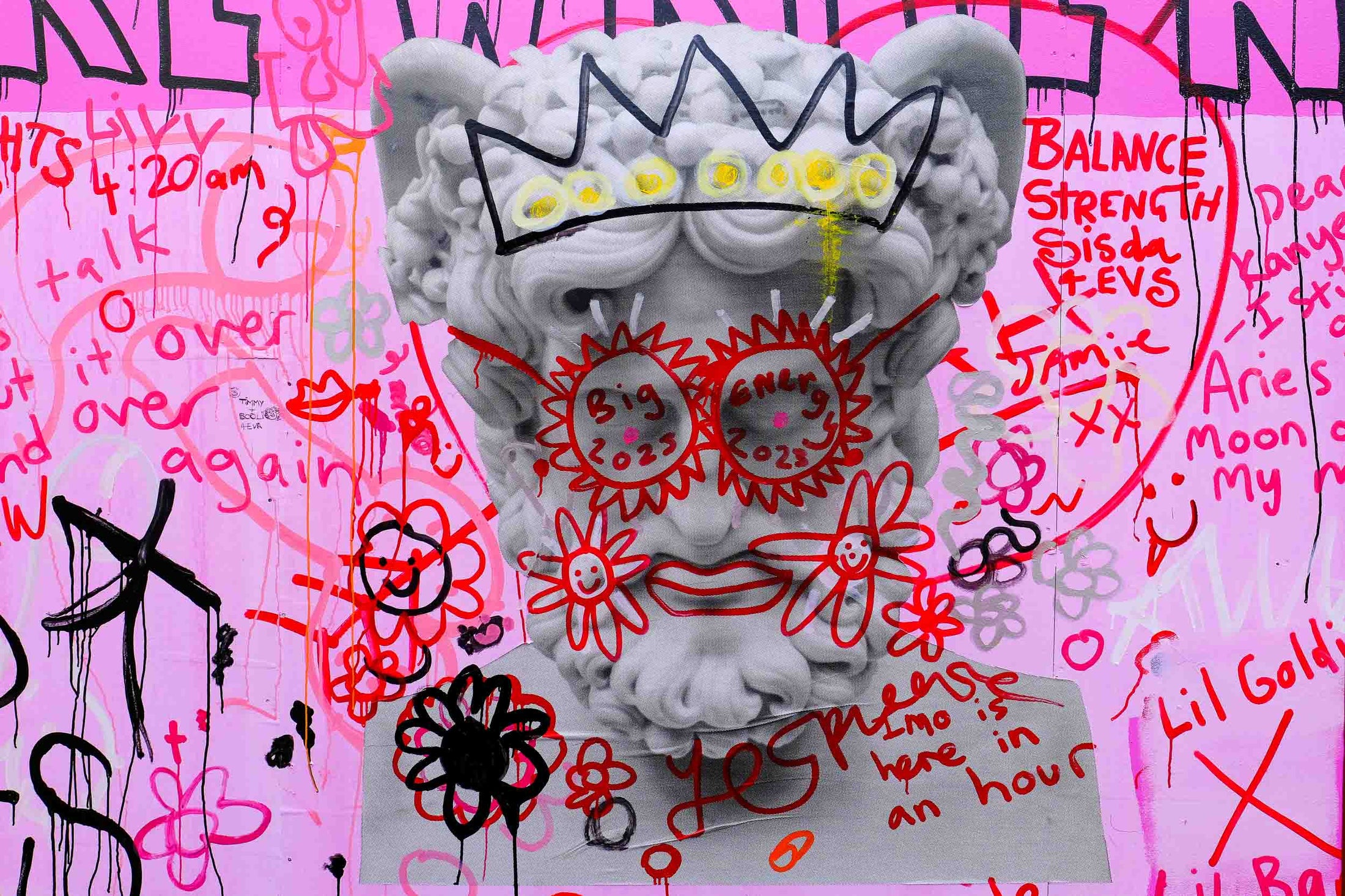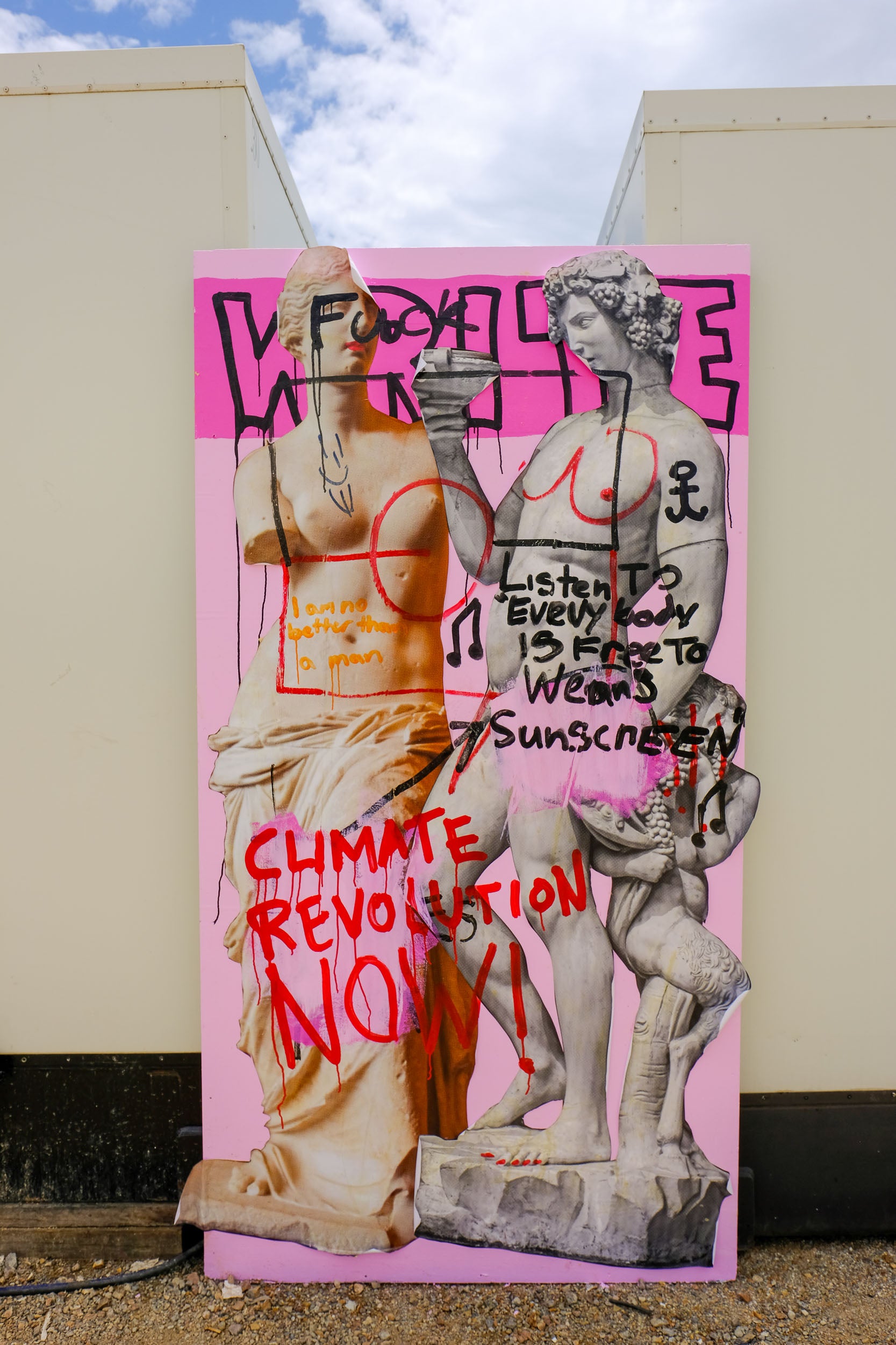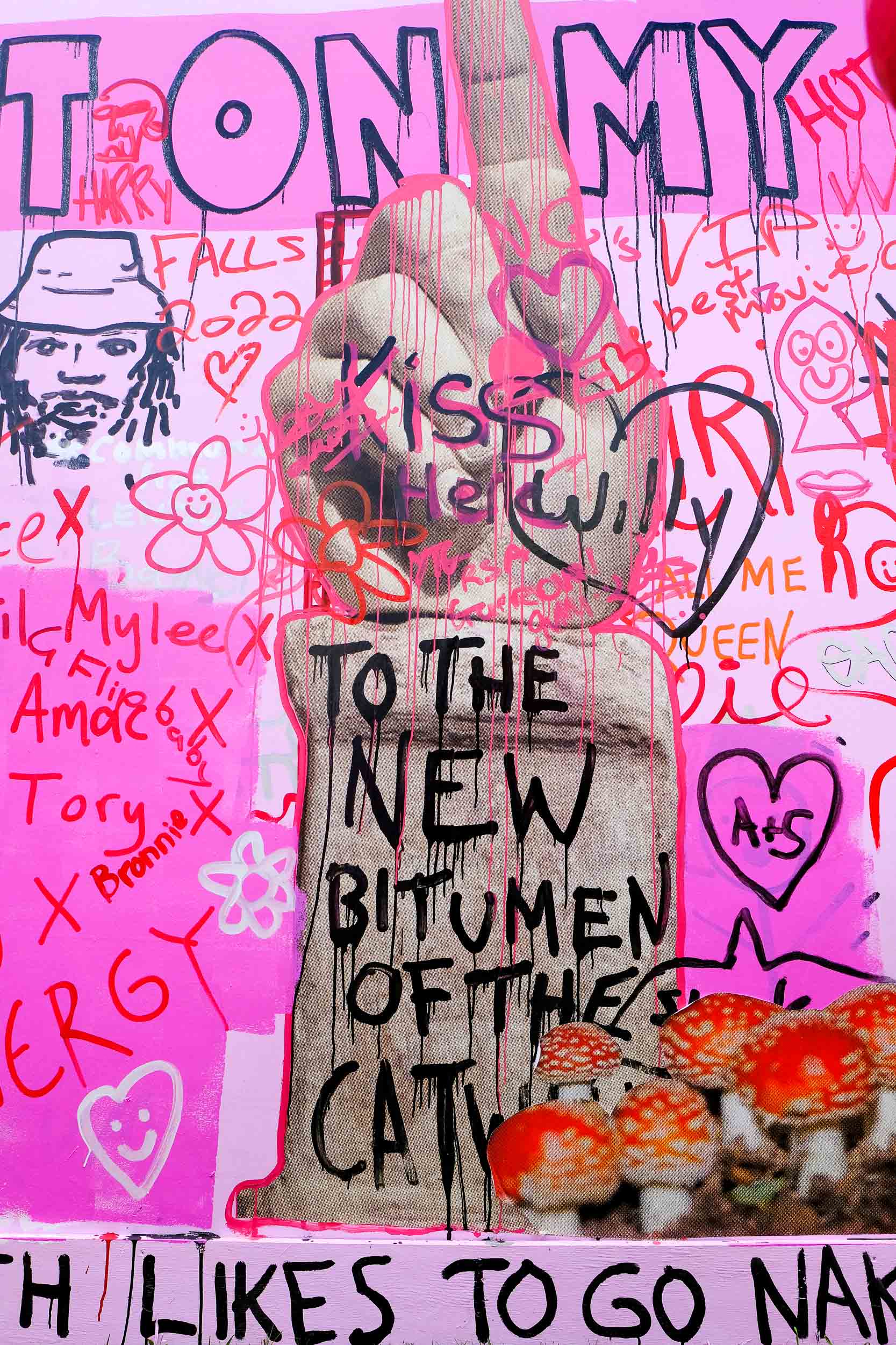 Paste-ups were added to the wall daily over three days: Roman and Greek marble statues, Fly Agaric mushrooms (Amanita muscaria) and smiley flags. Homage was made to Vivienne Westwood, a significant artist, cultural icon and activist.