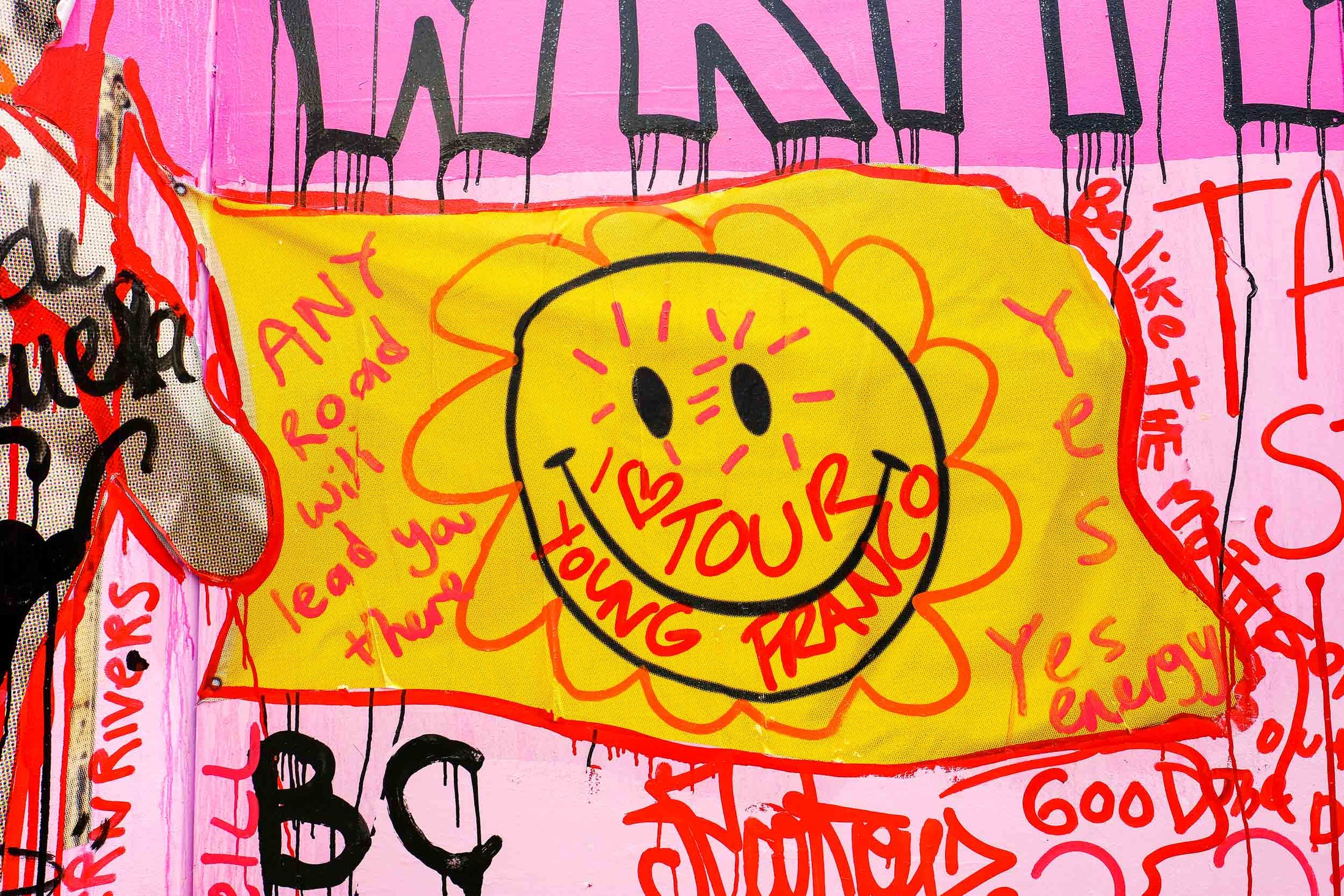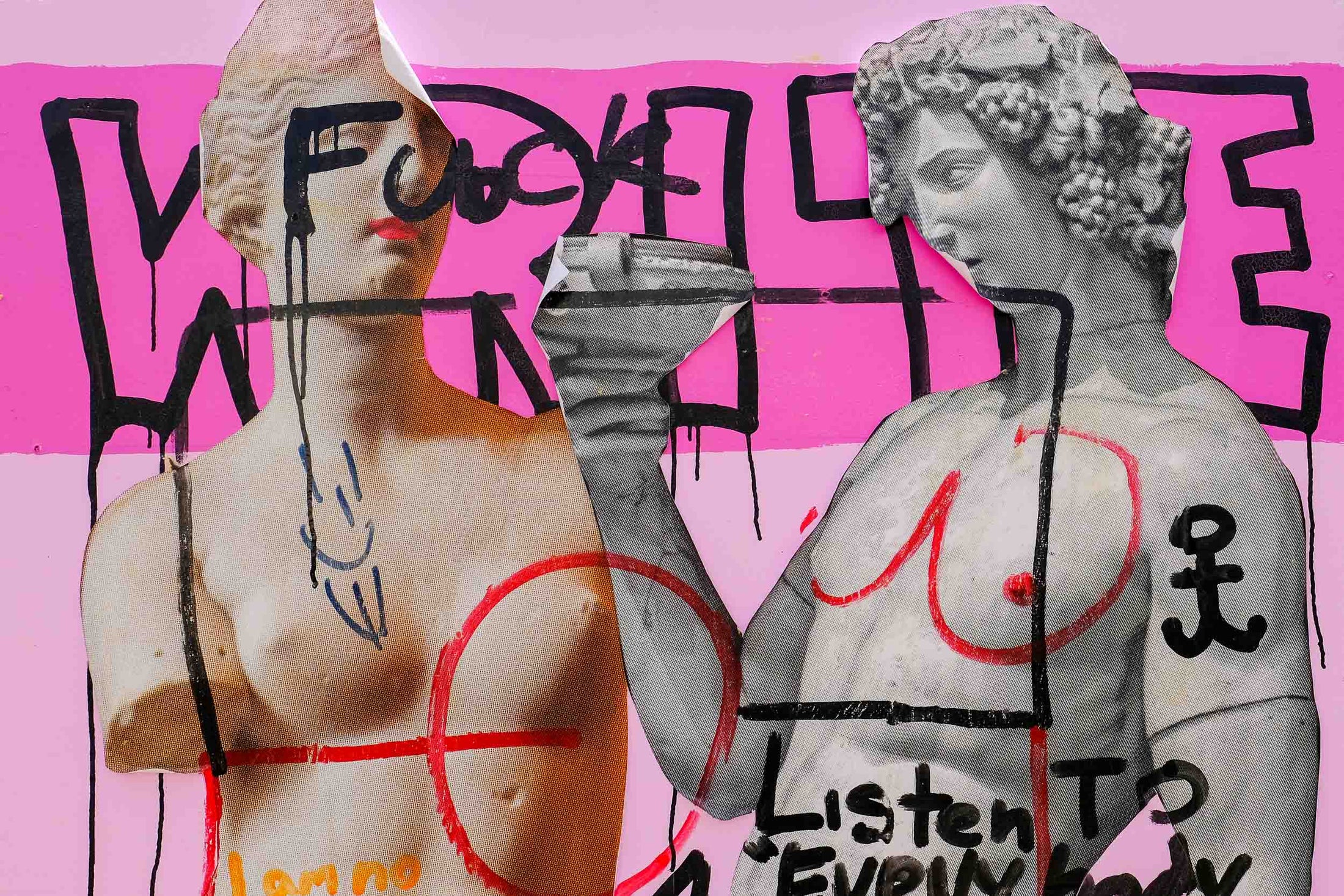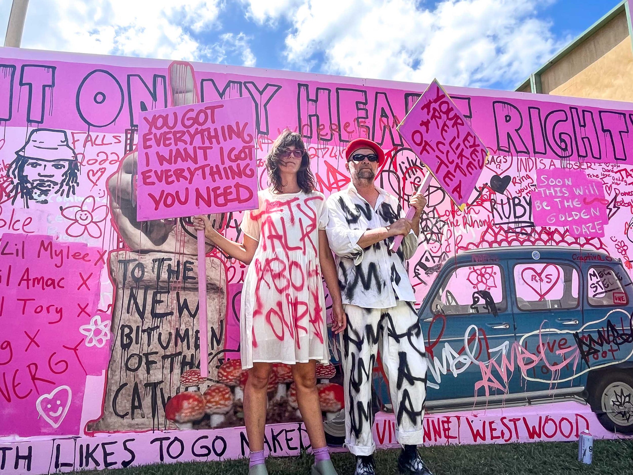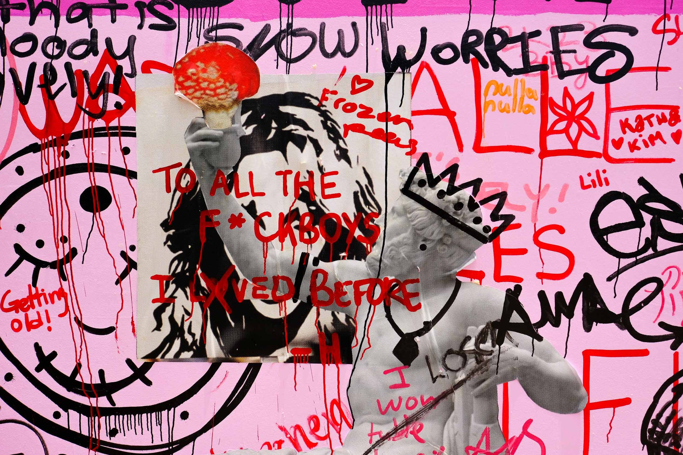 Paste-ups were added to the wall daily over three days: Roman and Greek marble statues, Fly Agaric mushrooms (Amanita muscaria) and smiley flags. Homage was made to Vivienne Westwood, a significant artist, cultural icon and activist.
